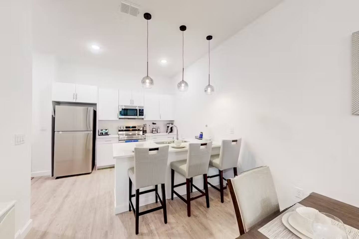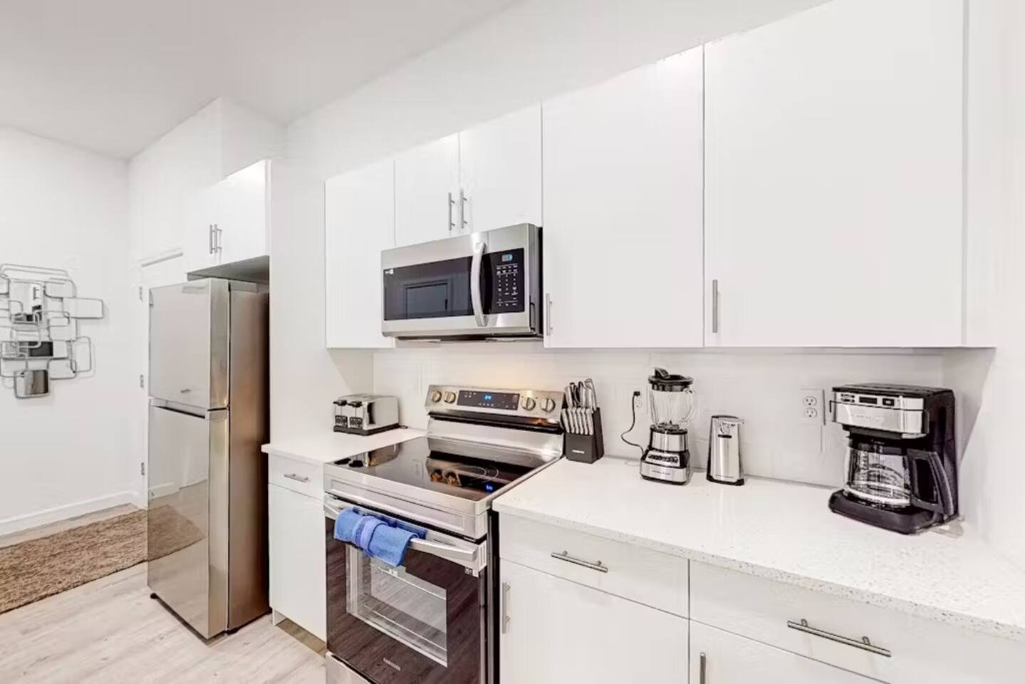 ➜ The kitchen is fully equipped with appliances including a fridge and a stove.